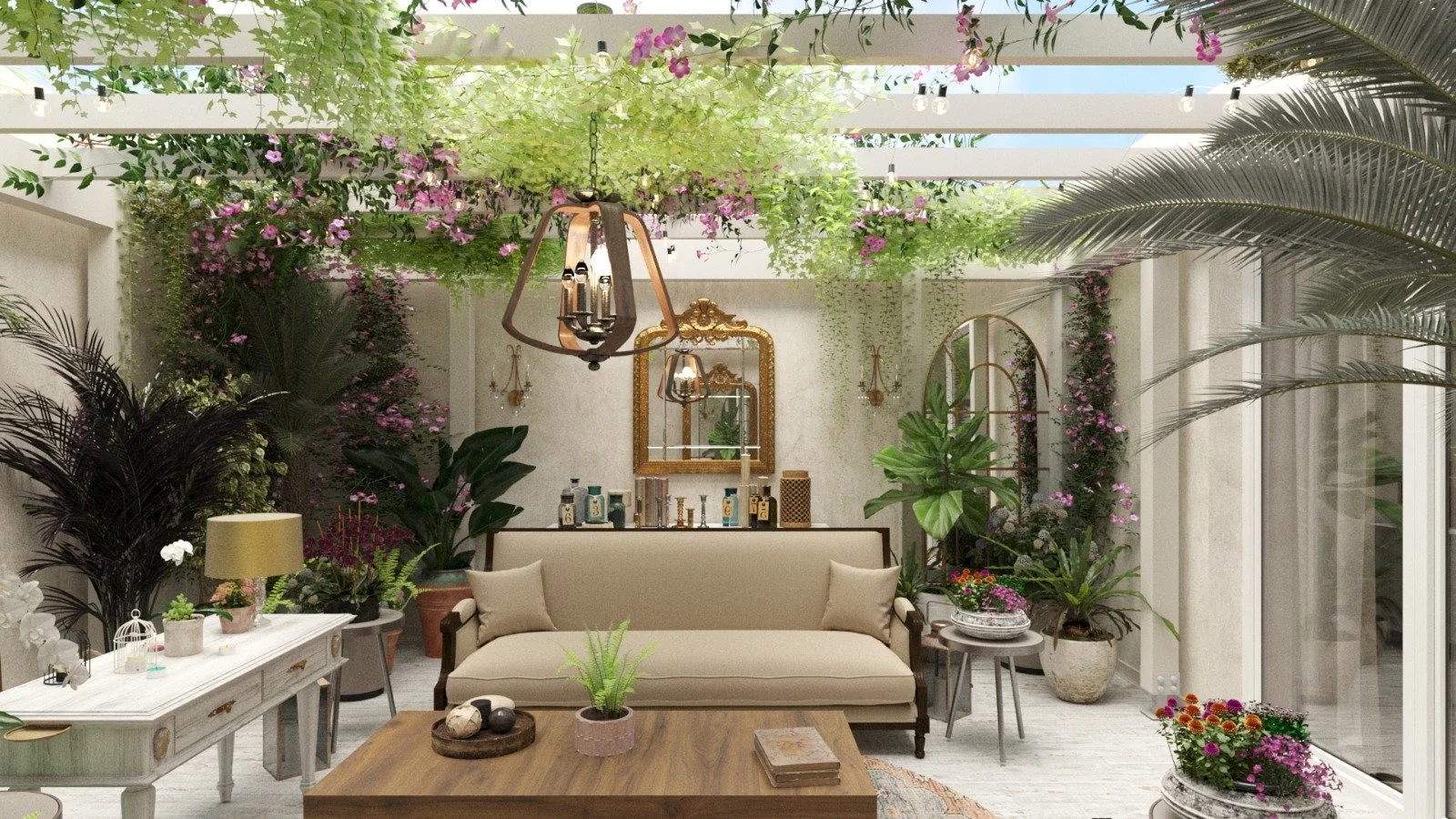 The concept is inspired by 18th and 19th century French and Swedish Rococo styles and includes antique cabinets, wall mirrors and an eye-catching chandelier. Generous planters with year-round plants and small trees soften the tall walls and a pergola with scented and hanging evergreen climbers creates a lavish vertical feature.